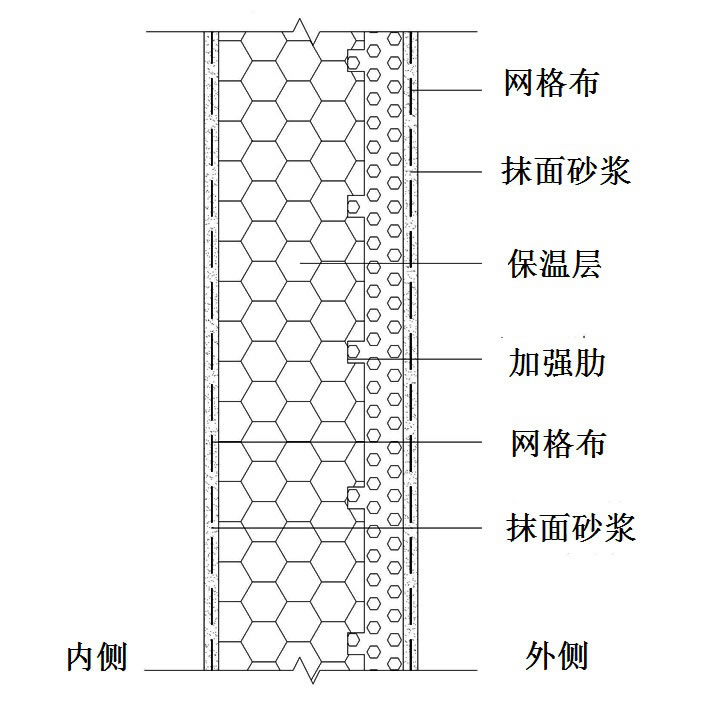 外墻保溫一體板經(jīng)工廠化預(yù)制,由保溫芯材(EPS\XPS\PU\石墨聚苯板\石墨擠塑板等)、防護(hù)層(膠粉聚苯顆粒漿料)、加強(qiáng)肋、內(nèi)外側(cè)加強(qiáng)層(硅酸鈣板、聚合物水泥砂漿(復(fù)合耐堿網(wǎng)格布或后熱鍍鋅電焊網(wǎng))等)組成,在現(xiàn)澆混凝土工程施工中起免拆外模板作用和保溫隔熱作用的復(fù)合外模板。